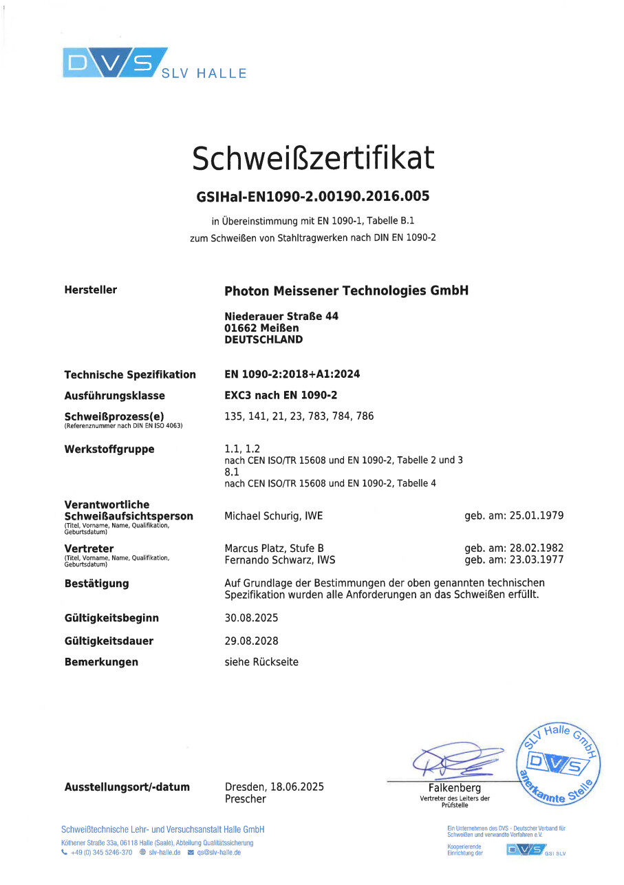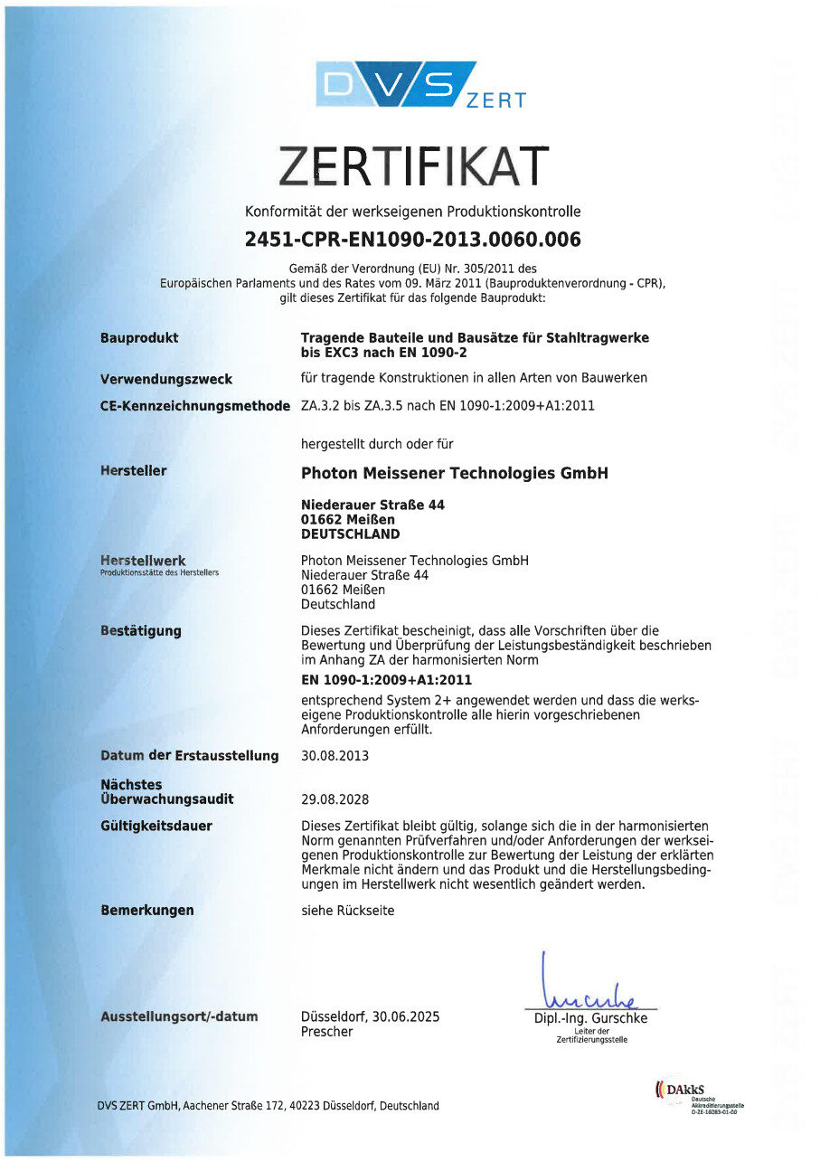 Mit einer Zertifizierung nach DIN EN 1090-1 bis EXC 3 ist die Photon Meissener Technologies GmbH bestens für die Aufgaben im Bauwesen ausgestattet und macht uns zum sicheren und idealen Partner für Ihre Projekte.