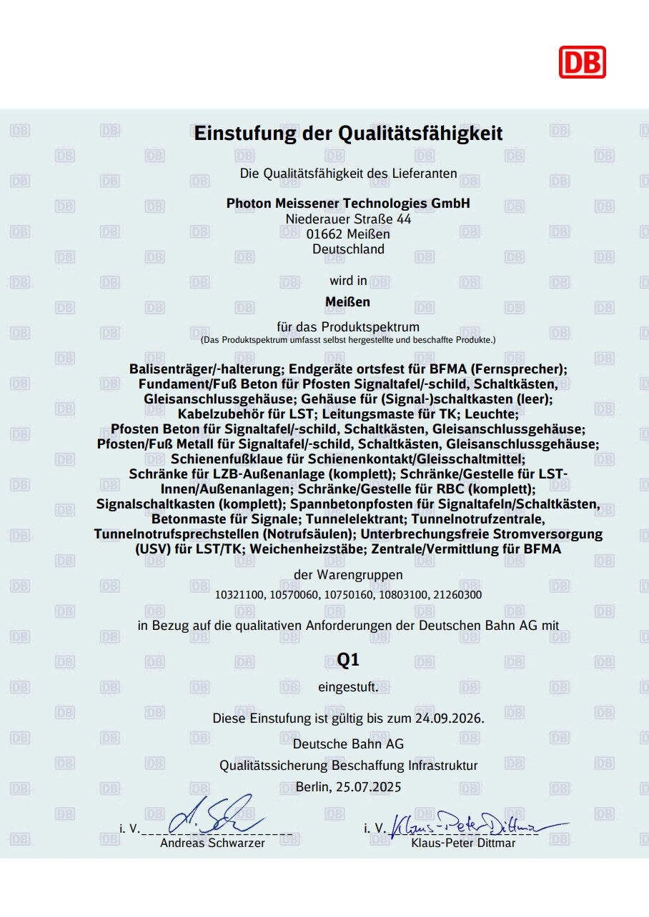 Einstufung als Q1-Lieferant der Deutschen Bahn
